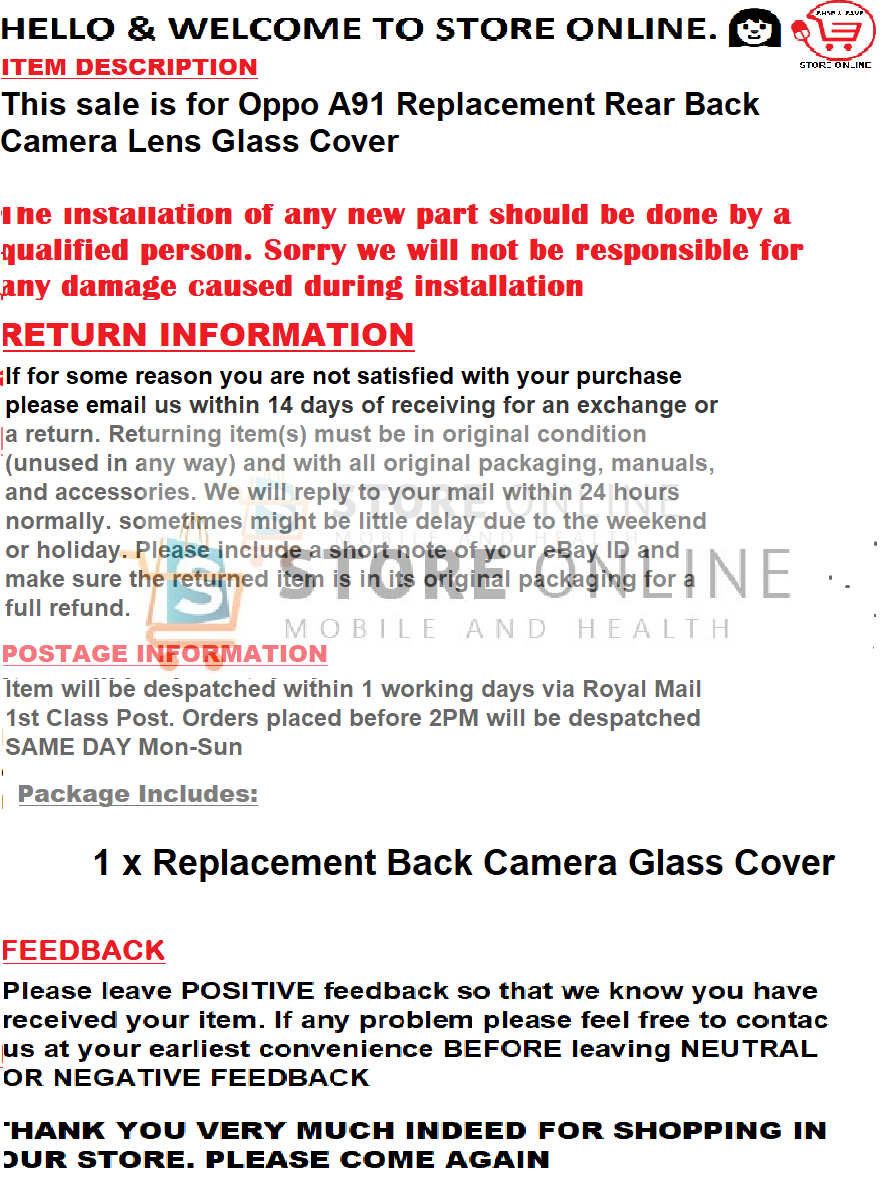 / Oppo A91 Replacement Rear Back Camera Glass Cover